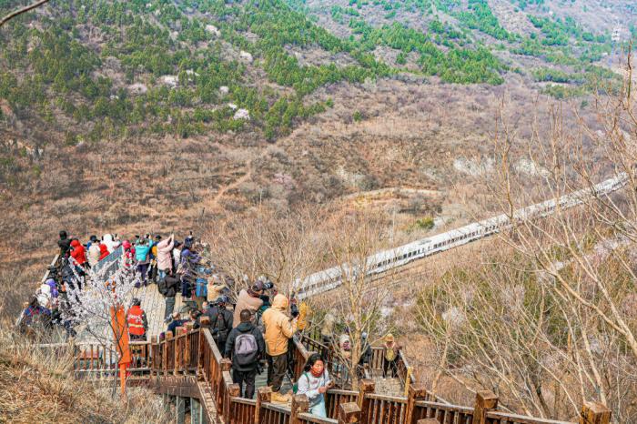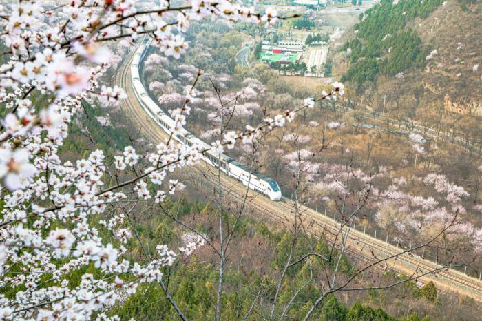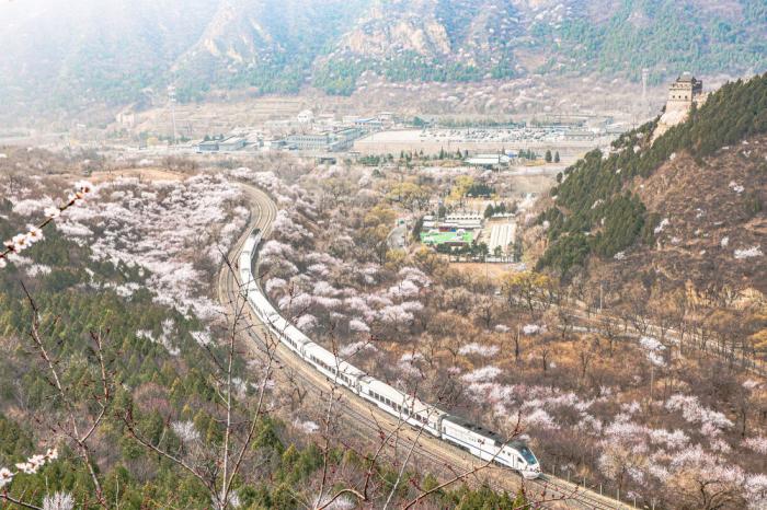 近日,北京居庸关长城脚下的山桃花渐次开放。北京市郊铁路S2线列车穿行于花海间,成为春日里一道美丽的风景,吸引游客和摄影爱好者前来观赏拍照。来源:中国图片集团