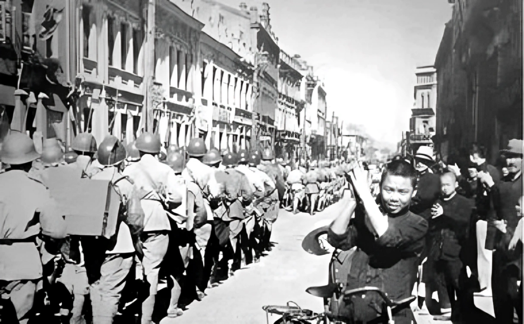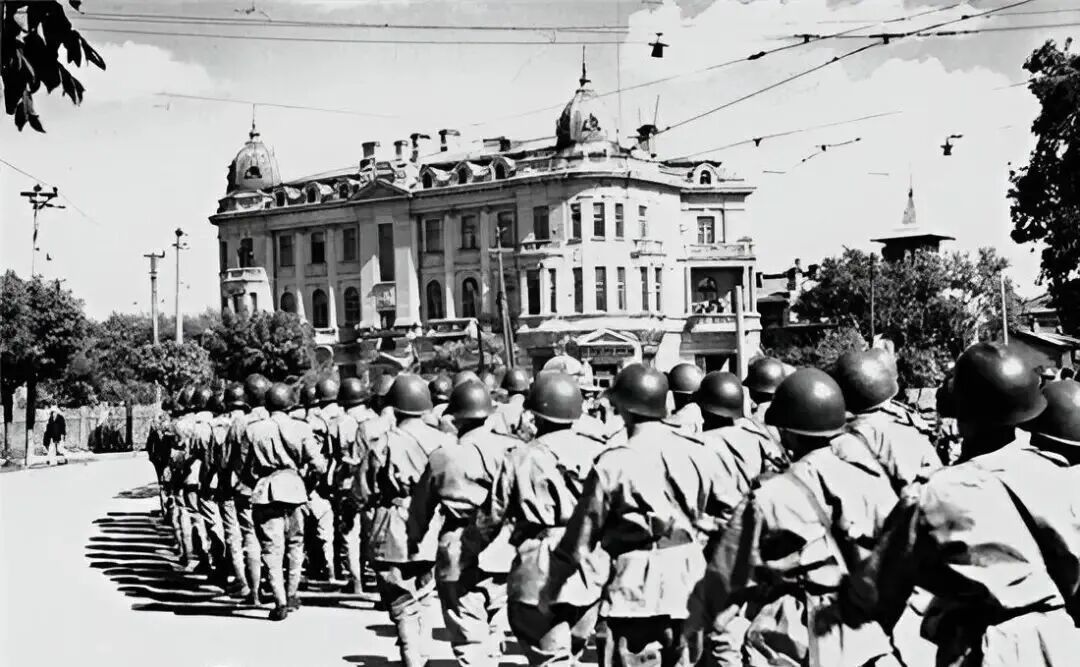 1945年,苏军一支部队从哈尔滨街头上走过。远处那座欧式建筑,是当年的“梅耶洛维奇宫”。始建于1921年。如今是市少年宫活动中心。
