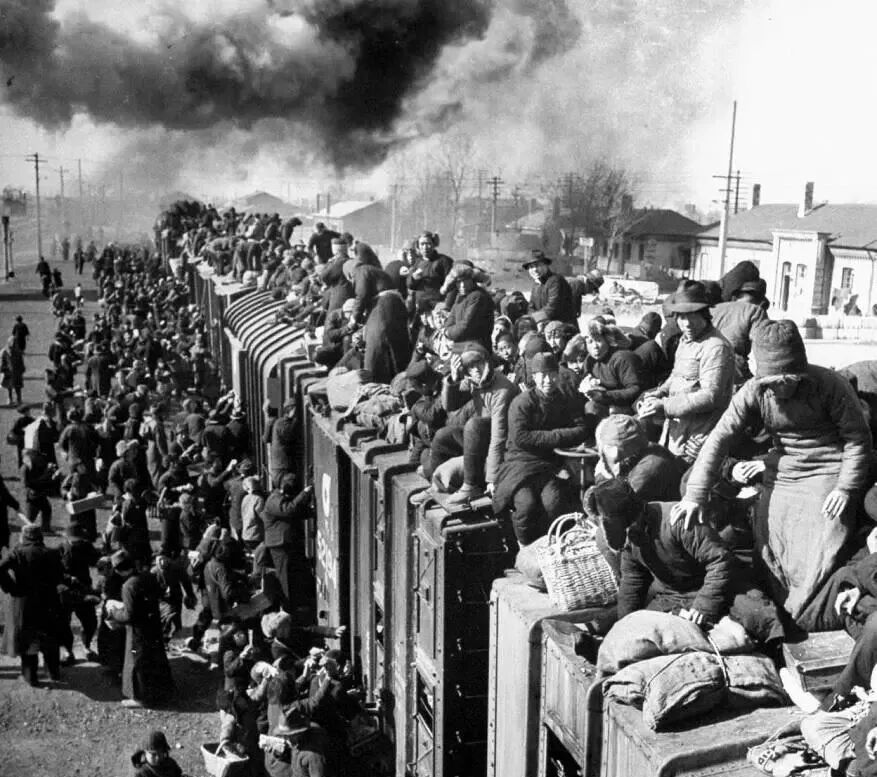 苏军占领东北后,没有帮助东北实施重建,而是大规模拆运东北的工业设备,致使很多工厂都变成了空壳,最终不得不停产。照片中,沈阳火车站上,当地百姓爬上火车逃难。