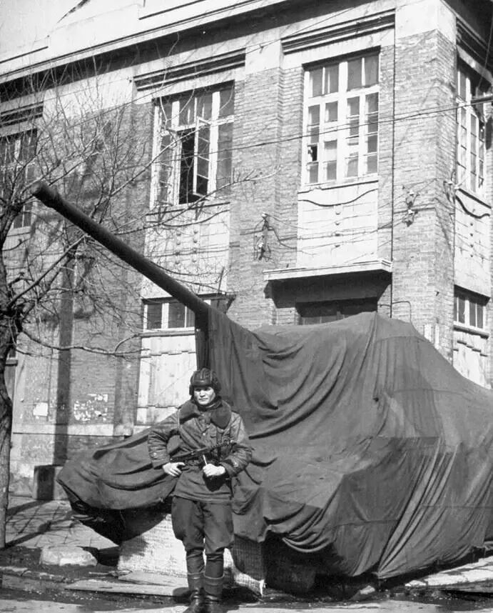 一名苏军士兵,把守在一辆坦克前,坦克上覆盖着雨布。这名士兵手里握着的是一把波波斯,该枪继承了波波沙的很多优点。
