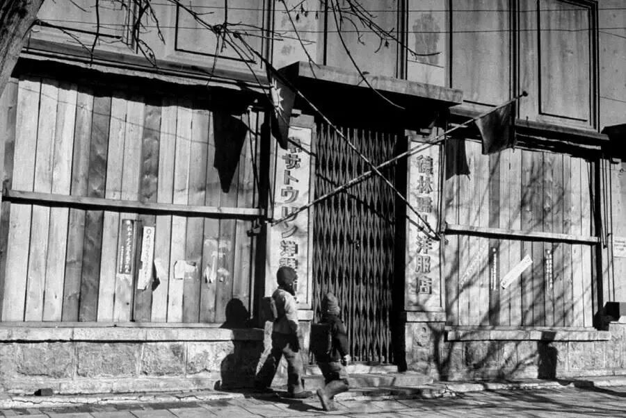 两个放学的小学生,背着书包从街头一家服装店门前走过。由于苏军的占领,很少有人光顾这家商店,最终这家店关门歇业,虽然门口仍插着两面不同的旗帜。