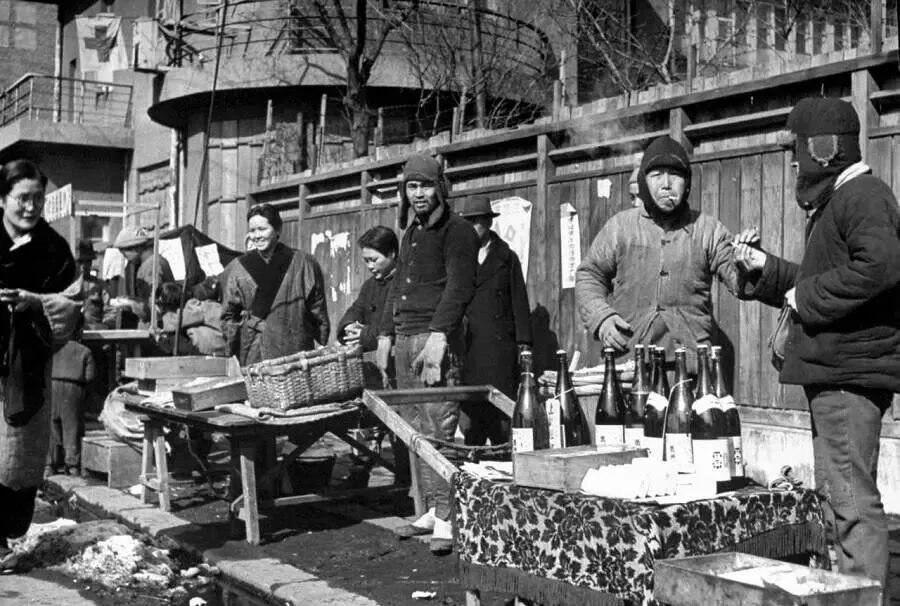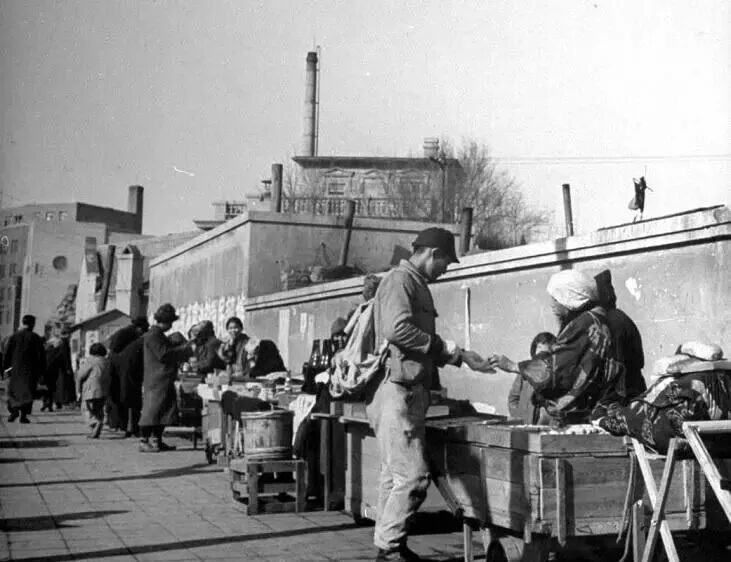 1945年,日军战败投降。一些日本侨民在返回日本前,在街头摆摊变卖值钱的家当。有日本的酒水、小商品等。此时的他们,早已经没有了往日的飞扬跋扈。