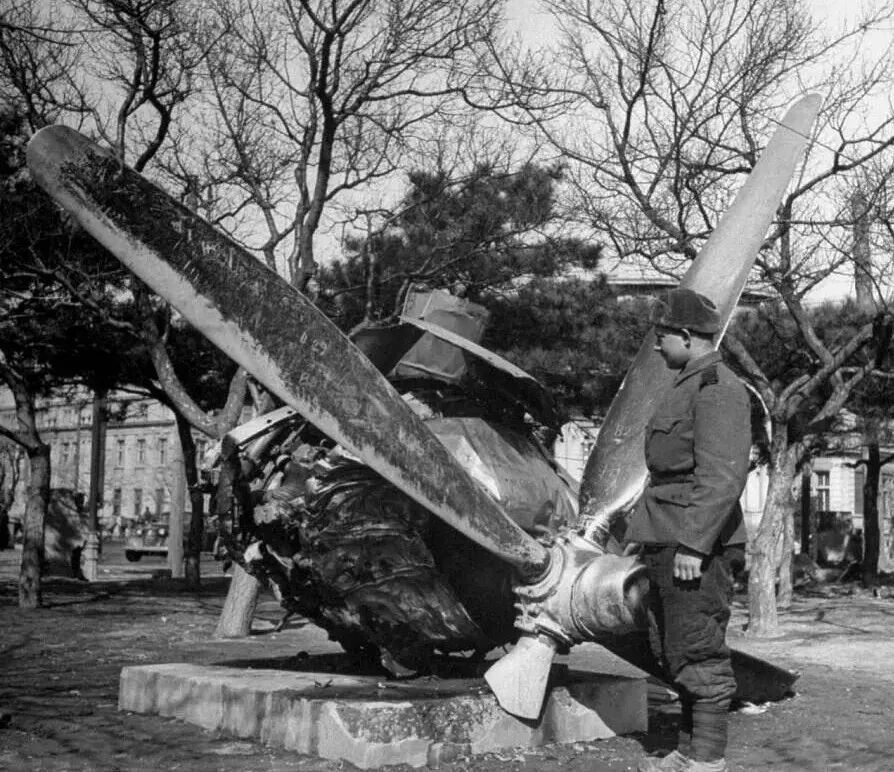这是被击落的日军一架飞机的螺旋桨,特意放在公园里展览。一名苏军士兵站在螺旋桨前,4片螺旋桨中的两片已经折断,不知去向。可见当时的战斗激烈程度。