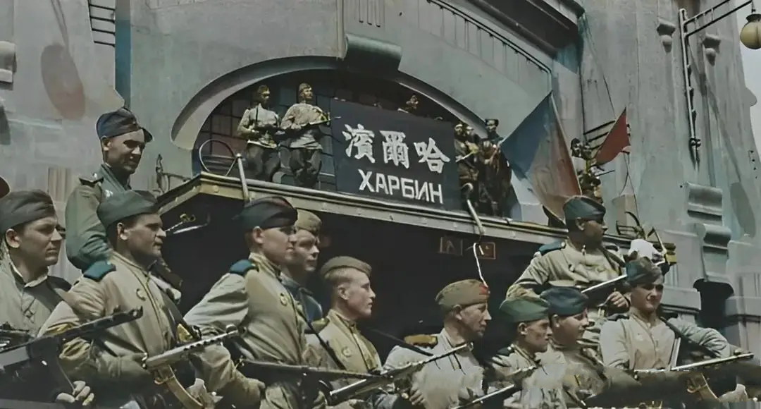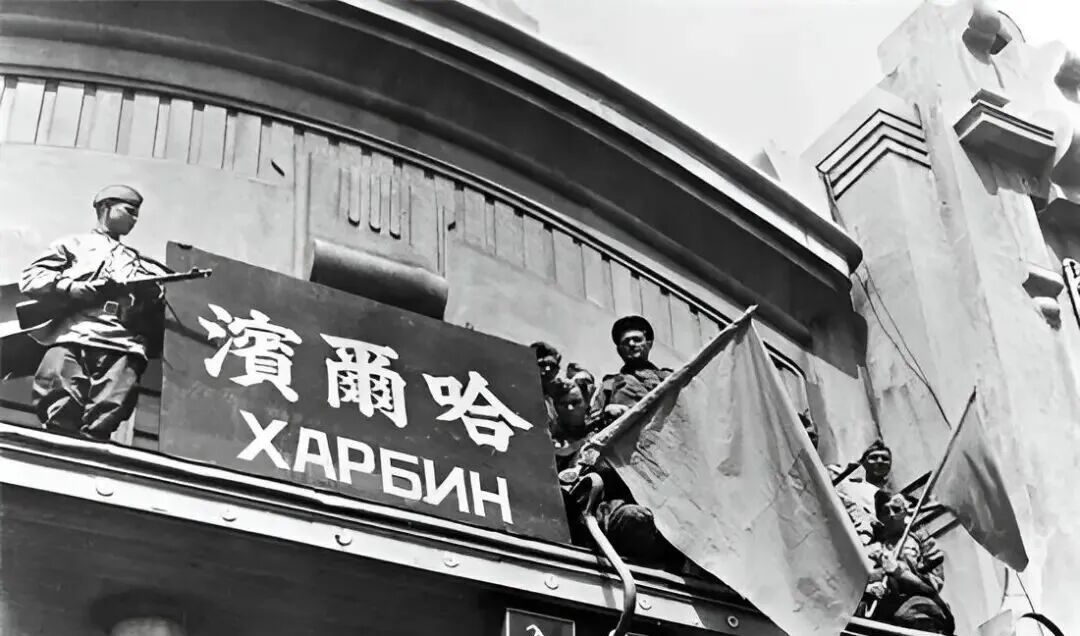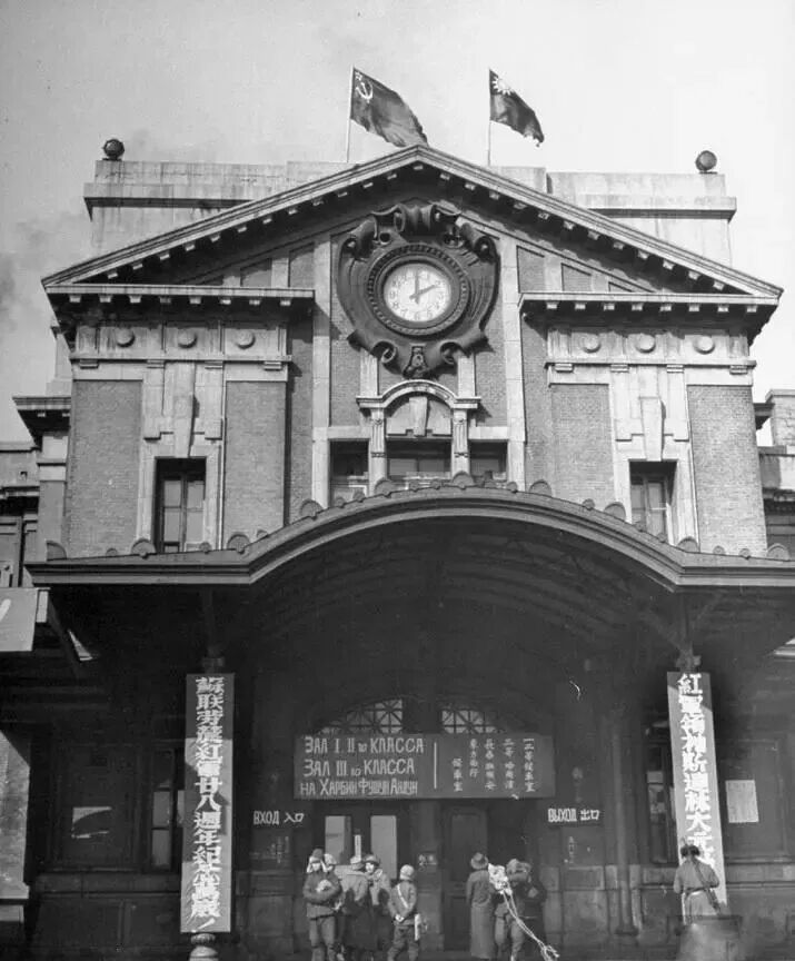日军投降后,苏军占领了哈尔滨火车站。一些苏军士兵将旗帜插在了火车站的房顶上。站房上“哈尔滨”三个大字十分醒目。
