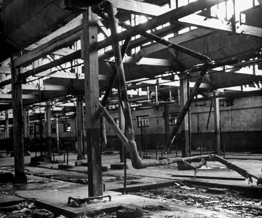 这是一家日本人在东北开办的工厂,苏军打败了日军后,搬走了这家工厂里所有的机器和设备。随后,又一把火将厂房焚烧掉,只剩下建筑的钢铁框架和一些管道。