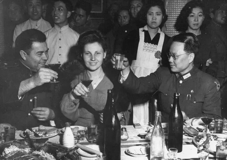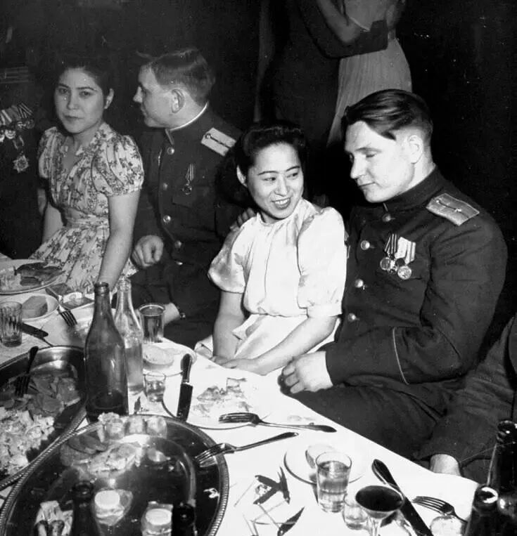 苏军占领东北期间,整日花天酒地,吃喝玩乐,沉迷于声色犬马的生活。照片中,苏联军官举行的宴席上,有两名女子陪座,他们的日子过得何等潇洒。