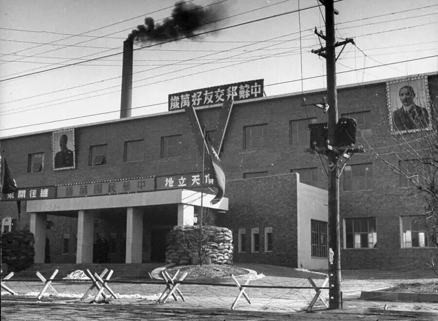这是当时东北的一家工厂,苏军占领了这家工厂。还在房顶上拉起了条幅和宣传牌。门口还设有两个沙袋垒砌的掩体。可见这家工厂何等重要。