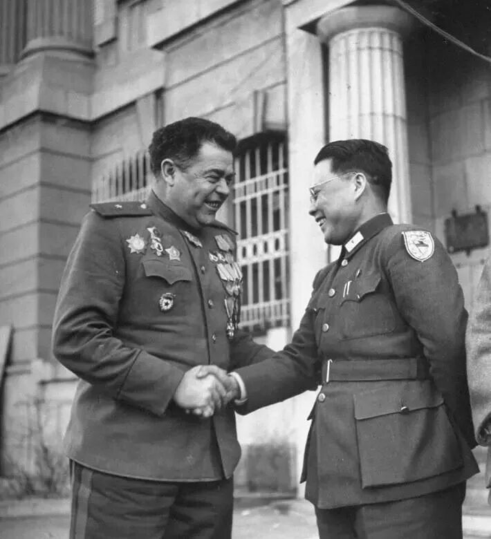 1946年3月,苏军占领沈阳。苏联将军科夫通·斯滕科维奇握着中国军官的手表示庆贺。实际上,科夫通·斯滕科维奇当时已经成为了沈阳这座城市的统治者。