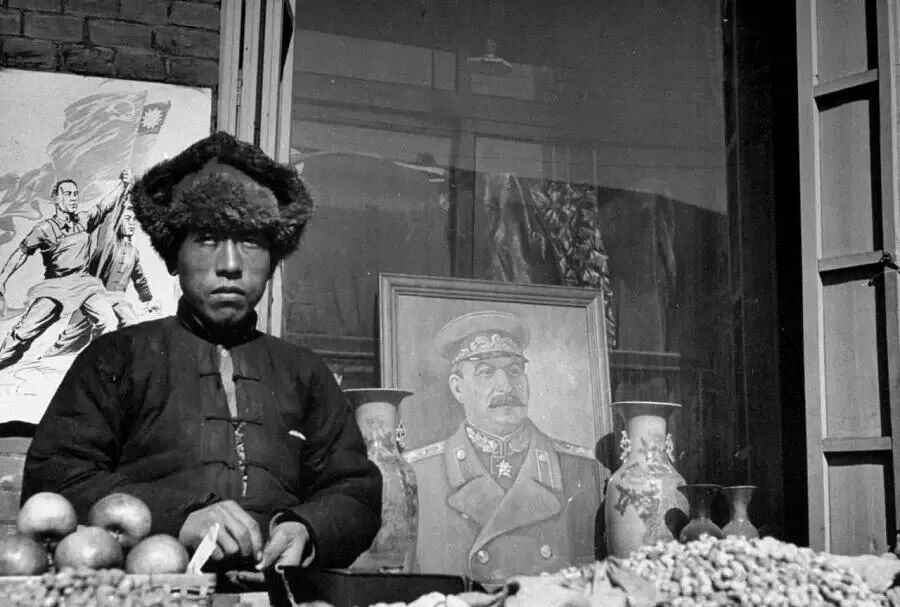 东北一名小贩,正在街头卖水果。摊位上摆放着苹果和花生。在他身后的商店里,有巨大的花瓶。苏军管辖下获准营业的商铺,都必须悬挂斯大林的画像。